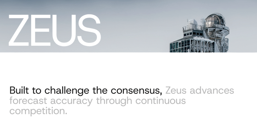 Zeus applies decentralized forecasting to environmental and climate data, leveraging large-scale datasets to rethink traditional prediction methods.