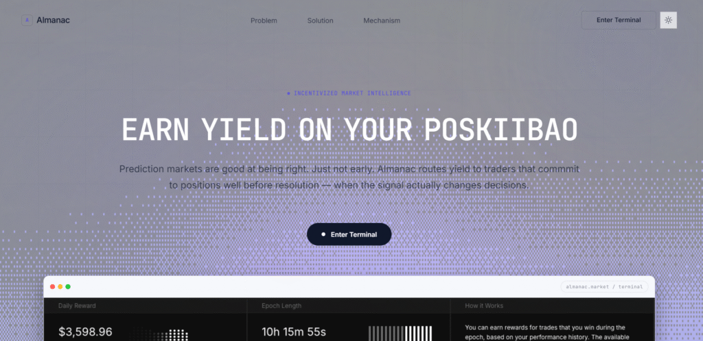 Almanac transforms event prediction into a competitive intelligence market, directly linking forecasting accuracy with financial outcomes.