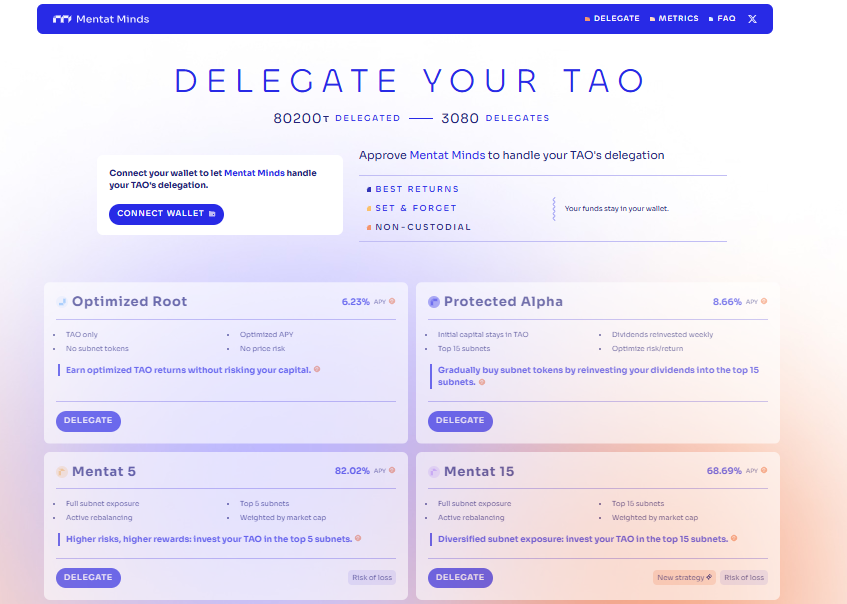 Mentat Minds is a custodial-free delegation service that helps users make the best out of their TAO rewards in the Bittensor network. It does away with the technical headache by offering proven strategies that take care of all the work, from delegation to rebalancing.