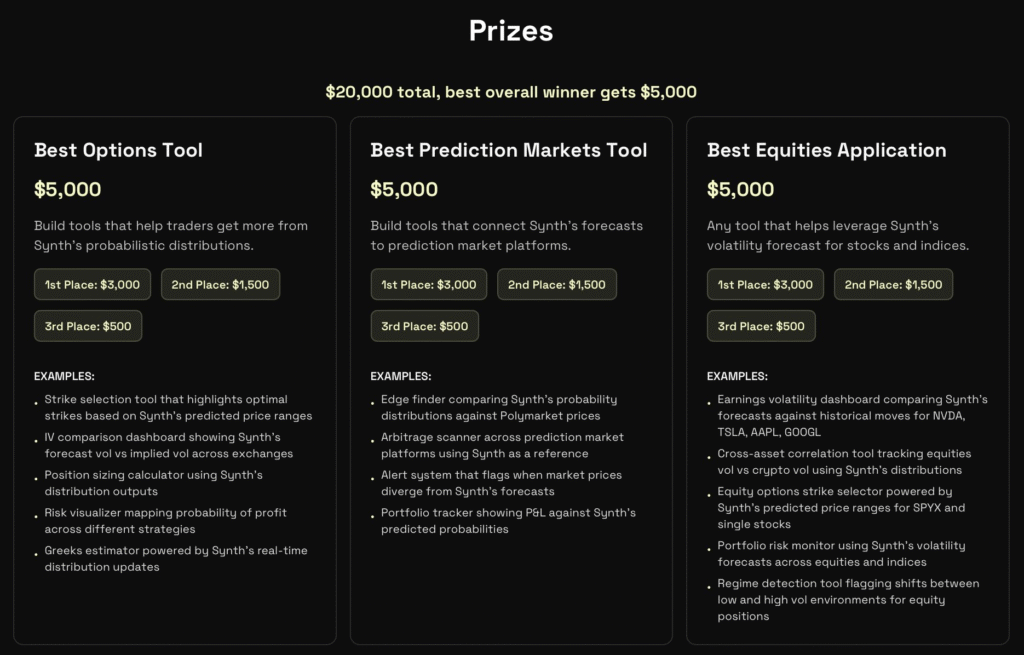 Synth (Bittensor subnet 50) just launched a $20,000 hackathon built around probabilistic market intelligence. Builders get access to Synth’s predictive intelligence API and are expected to ship real tools for options, prediction markets, and equities.
