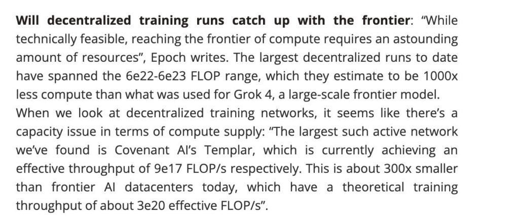Right now, the biggest decentralized training runs are achieving about 6e22 to 6e23 FLOPs of compute. That sounds like a lot until you realize it’s about 1,000 times less than what was used to train Grok 4. FLOPs are basically a measure of how much computing work gets done—more FLOPs means more powerful AI.