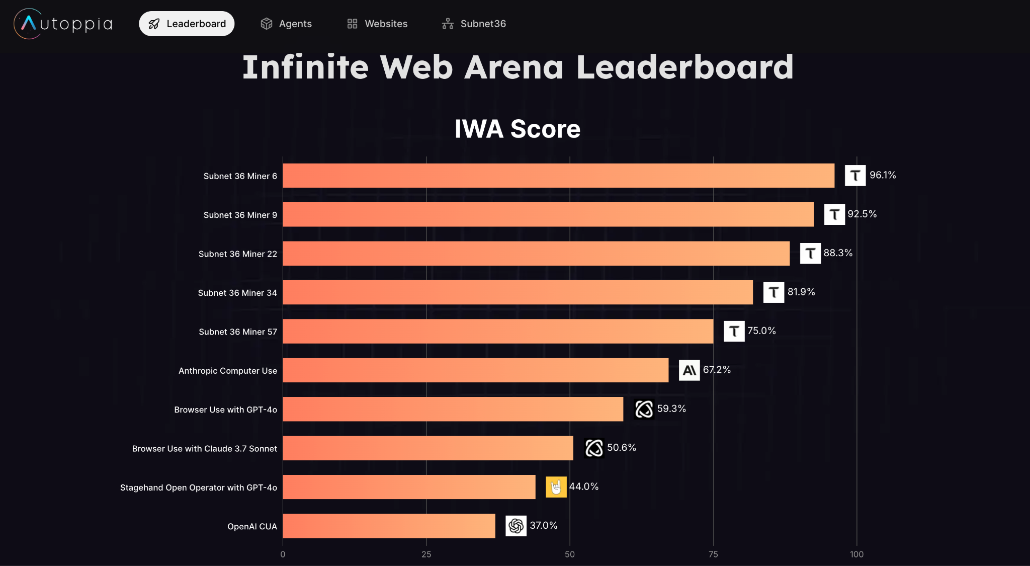 - Anthropic: Their “Computer Use” agent excels at coding and technical workflows, often outperforming OpenAI in that niche. However, it’s less focused on everyday web navigation. Autoppia, with its Infinite Web Arena (IWA) training and live performance dashboard, is targeting exactly those routine web tasks—an area where Anthropic isn’t as specialized.