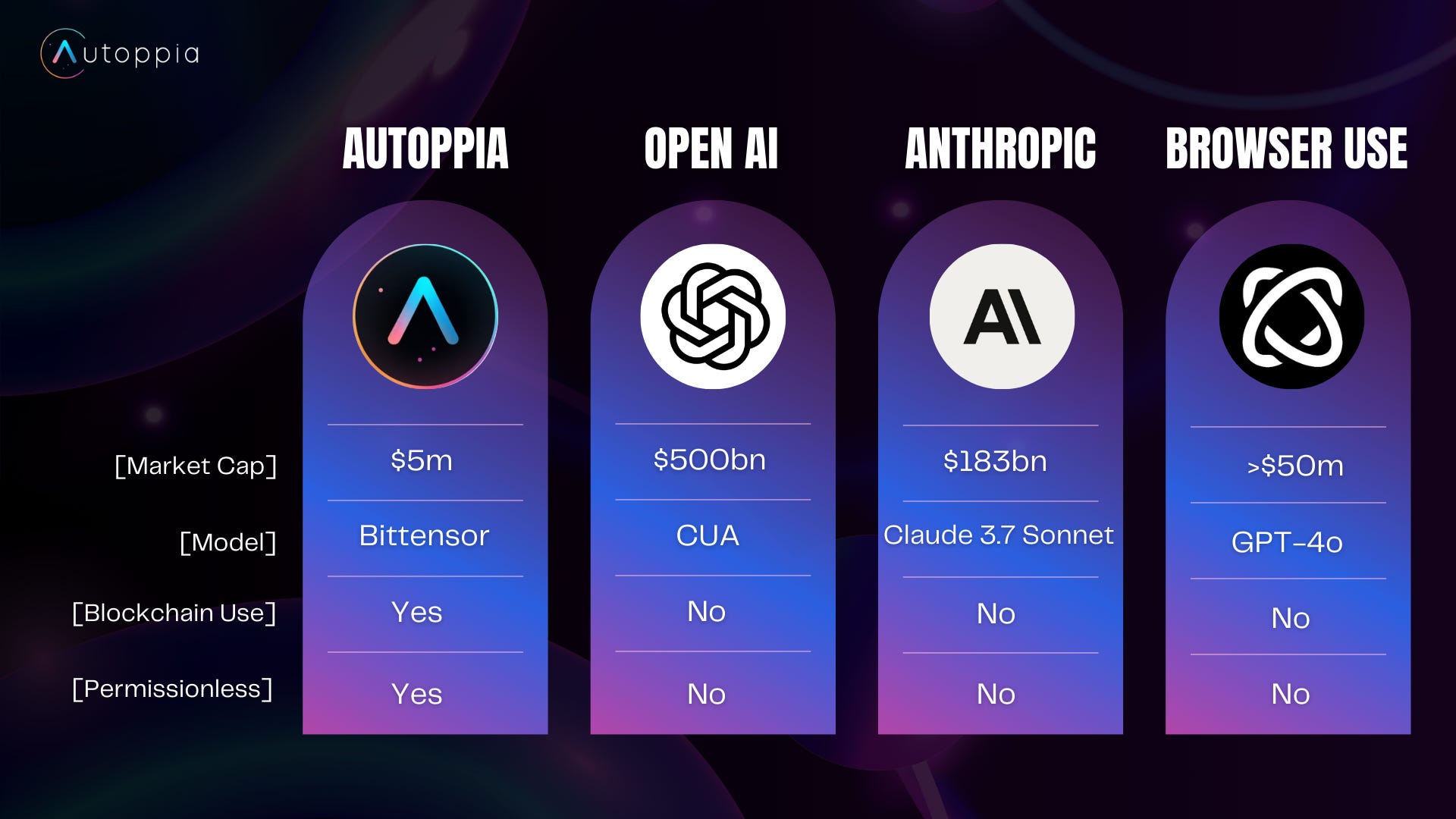 The race to master web operations is heating up. It’s a big deal because businesses and individuals are desperate to save time on repetitive online tasks. Companies like OpenAI, Anthropic, Virtuals Protocol, and Browser Use (which just raised $17 million!) are in the game. But Autoppia is bringing something different: a decentralized approach powered by the Bittensor ecosystem.