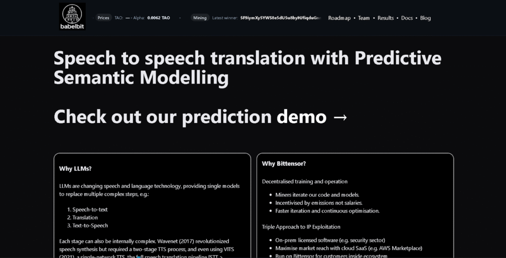 Babelbit (Subnet 59) is a decentralized network on the Bittensor blockchain dedicated to solving the problem of real-time, low-latency speech-to-speech translation in global communication.