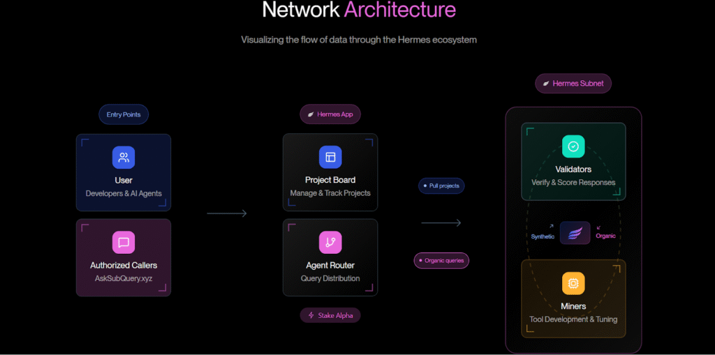 Instead of relying on large, general-purpose language models, Hermes incentivizes specialized AI agents that are purpose-built to query, interpret, and respond to on-chain data. These agents compete within the subnet, with performance measured on speed, accuracy, and cost efficiency.
