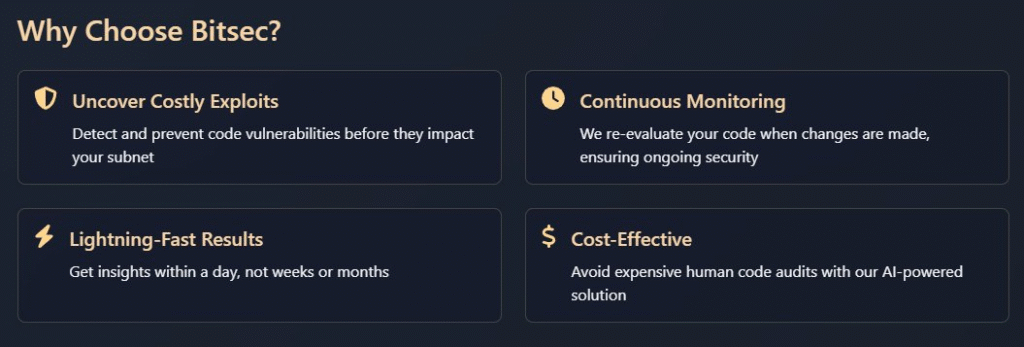 Bitsec V2 is the first Bittensor subnet to connect AI, cybersecurity, and real-world revenue. It proves that TAO-based incentives can power profitable, real economic activity, starting with a market worth $1.5B+ in smart contract auditing alone.