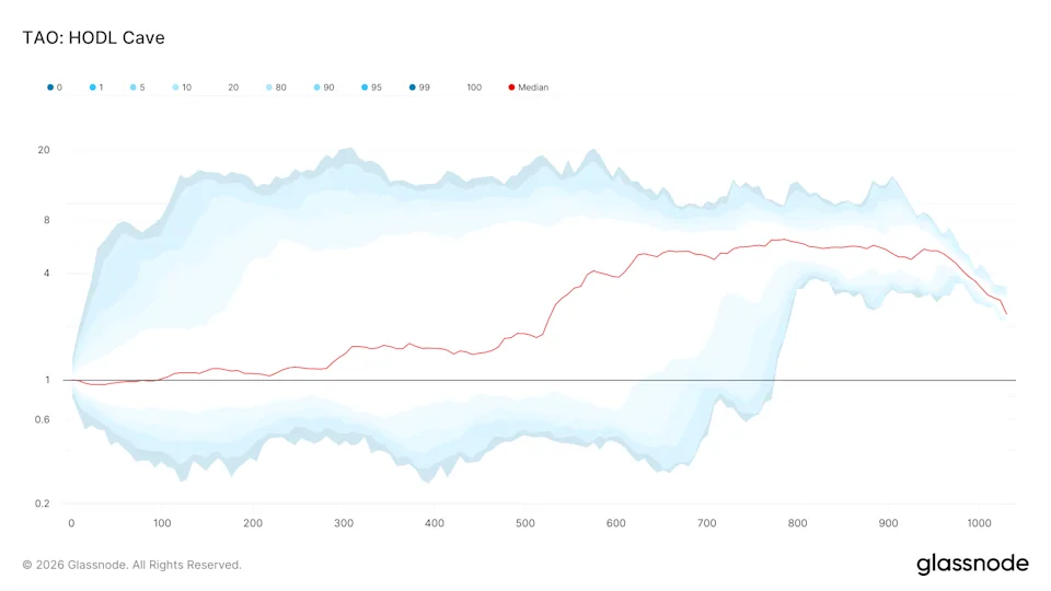 According to Glassnode’s HODL Caves data, most wallets that accumulated $TAO over the past seven months remain either underwater or only marginally profitable at current prices.