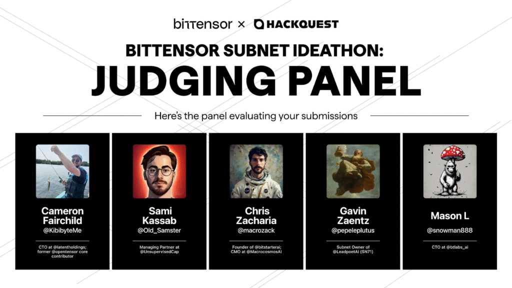 Judges included Cameron Fairchild (CTO at Latent Holding), Sami Kassab (Managing Partner at Unsupervised Capital), Chris Zacharia (CMO at Macrocosmos), Gavin Zaentz (CEO at Leadpoet AI), and Mason Levey (CTO at BTLabs).