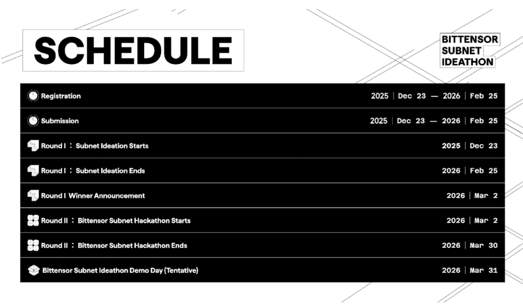 With Round I complete, the ideathon now moves into its next phase. At this point, already started on March 2 according to the official schedule, advancing teams will start building and testing their subnet concepts on Bittensorβs testnet.