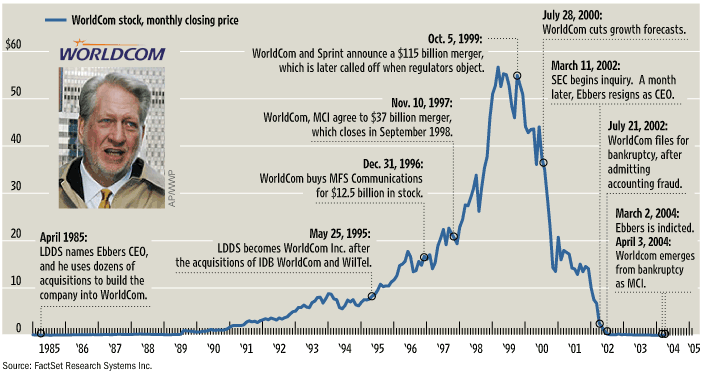 To understand the scale of the crisis, consider these examples. WorldCom aimed to connect the world via fiber. At their peak, 50% of global internet traffic flowed through their cables. They were on the verge of joining the top five most capitalized companies in the world alongside Dell and Microsoft, hailed as the ‘company of the century.’ They ended up falsifying their accounts and imploded in one of the largest frauds in history. Yet, without WorldCom and the other now-defunct companies, we wouldn’t be able to transmit images, video, and audio across the web today.