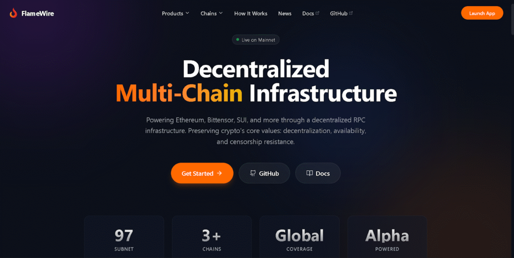 Flamewire launched earlier, around mid-2025, and already supports multiple blockchains including Ethereum, Sui, and Bittensor. They focus on reliability through redundancy and intelligent routing. Their system distributes traffic globally and reroutes around problems automatically. Users fund accounts or stake SN97 alpha tokens to access services or get free tiers.