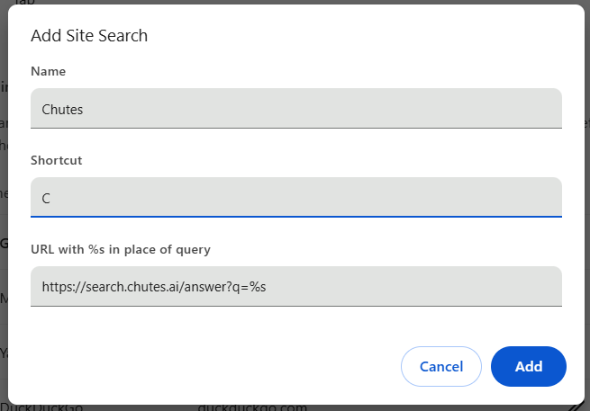 3. Customize the fields and add https://search.chutes.ai/answer?q=%s as the URL.