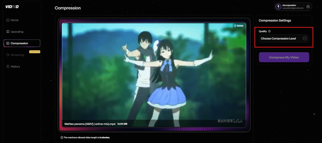 4. After successful file upload, choose the quality level from the available options. Then, click on ‘Compress My Video’.