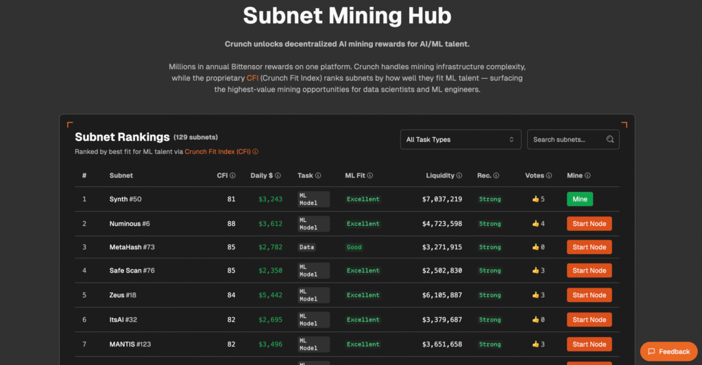 Crunch has launched a mining dashboard and hub designed to simplify the entire process. Instead of forcing contributors to learn the mechanics of Bittensor, Crunch abstracts the coordination layer away.