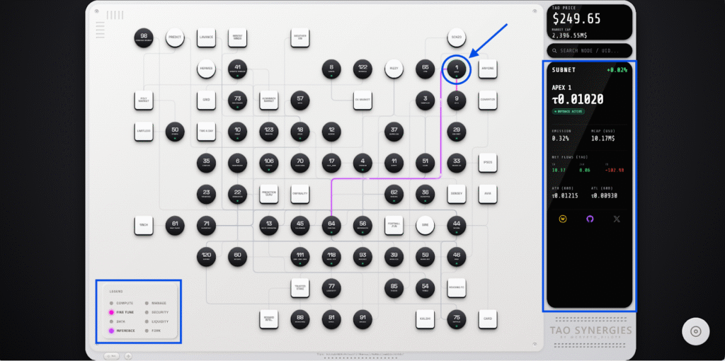 It is a one-pager dashboard that gives a clear view of synergies happening within the ecosystem. Asides providing these visuals, it also gives key information (like current alpha value, market cap, top subnet gainers & losers and $TAO token chart for 30 days ) about the Bittensor ecosystem.