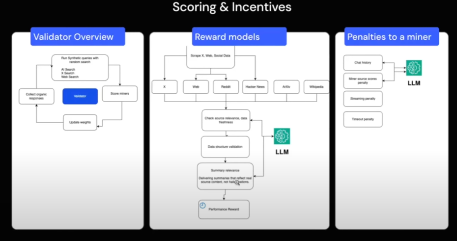 Bittensor’s validator–miner architecture powers Desearch’s performance and decentralization. Validators score miners based on relevance, freshness, accuracy, and latency, ensuring that the best-performing miners rise in rank and earn more TAO rewards. This competition drives quality upward—something centralized APIs simply can’t replicate.