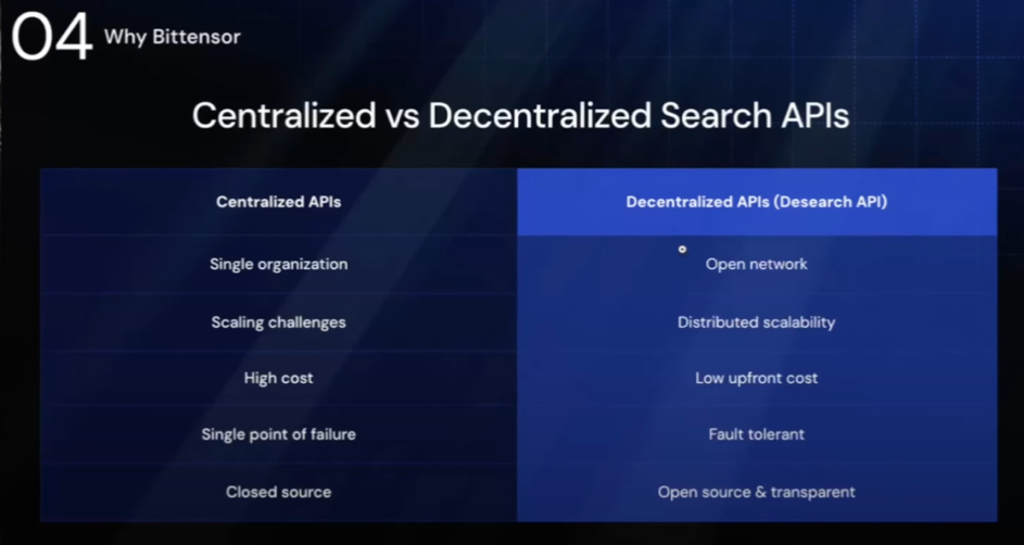 Desearch marks a pivotal shift for Bittensor — from AI model training to AI data infrastructure. As centralized APIs tighten access and raise costs, Desearch offers: