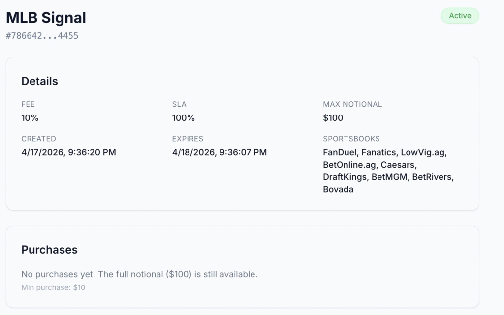 On the buyer side, the interface keeps friction as low as possible. Purchasers can review the general information of any signal proposal before committing, confirm the parameters they care about, and complete the transaction quickly.