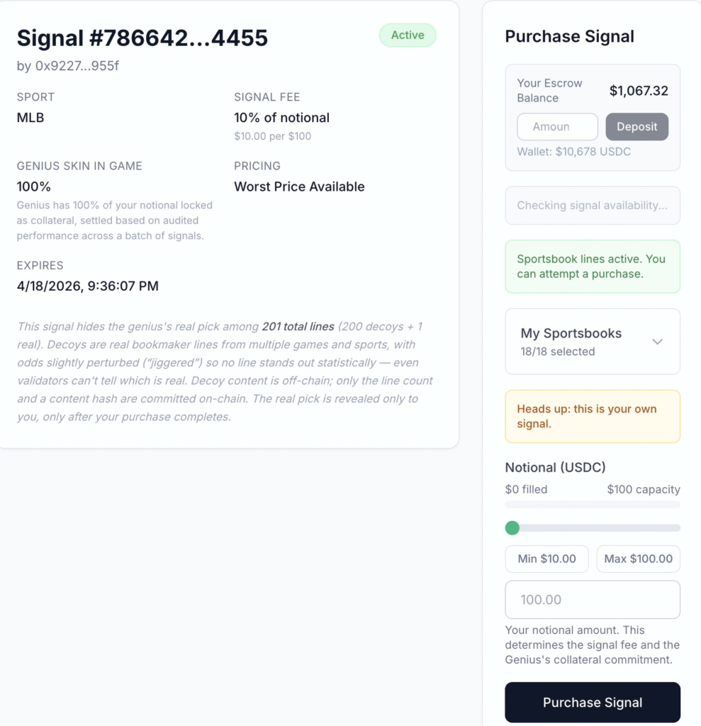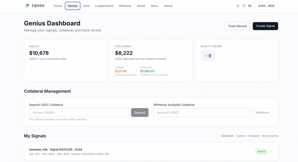 This verification layer is what separates Djinn from a simple peer-to-peer marketplace. The blockchain does not just record the transaction, it validates the signal’s legitimacy before it ever reaches a buyer.