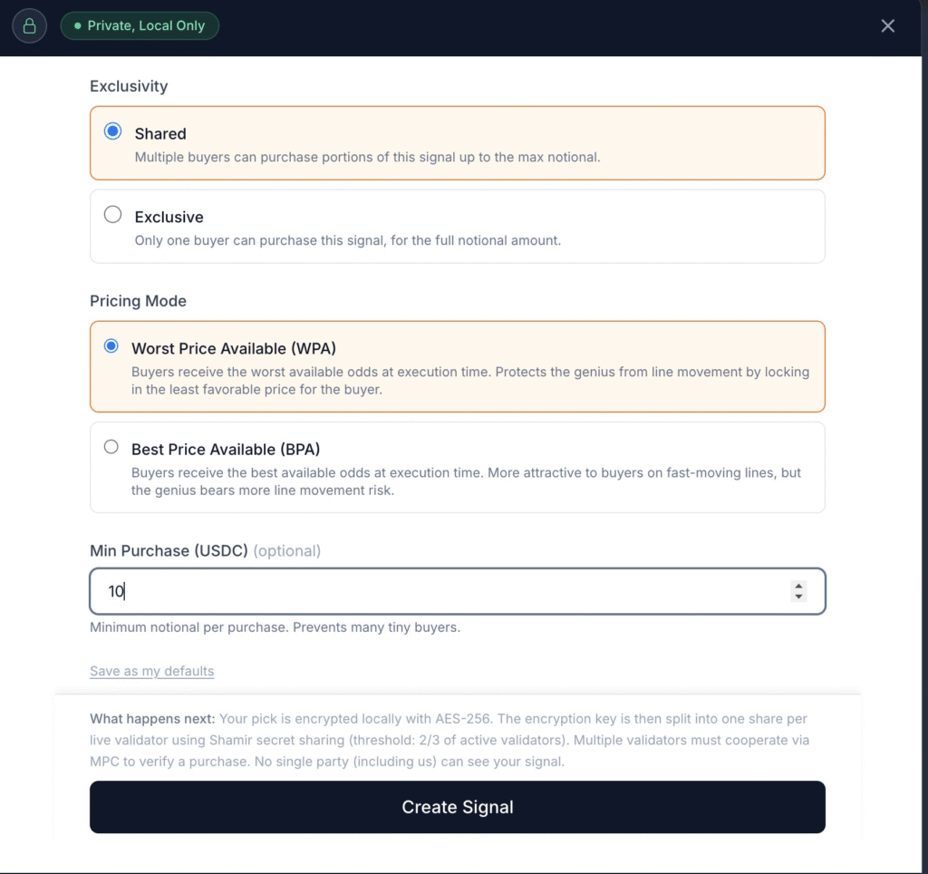 A user identifies their event, sets the signal parameters, locks in the price, minimum purchase threshold, and any additional conditions, and sends it live.