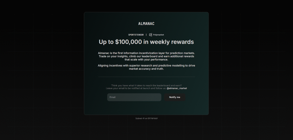 Almanac Market, a product powered by Sportstensor (Subnet 41 on Bittensor), positions itself as a refinement layer on top of Polymarket. It routes trades through Polymarket’s liquidity while applying a simple but powerful filter: a 1% trading fee.