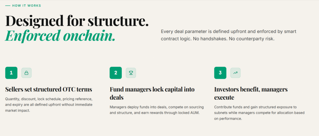 Subnet owners or token holders define OTC terms in advance, including quantity, discount, lock duration, pricing references, and expiry logic. Capital is raised without destabilizing the secondary market.
