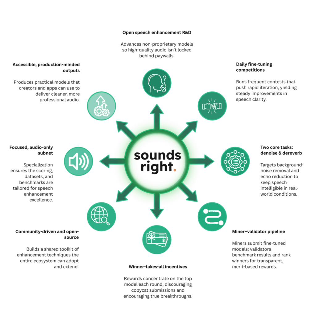 SoundsRight, built on Bittensor, is dedicated to speech enhancement. It hosts daily model competitions that improve how machines clean audio. These competitions refine models that remove background noise, reduce echo, and make speech crystal clear.