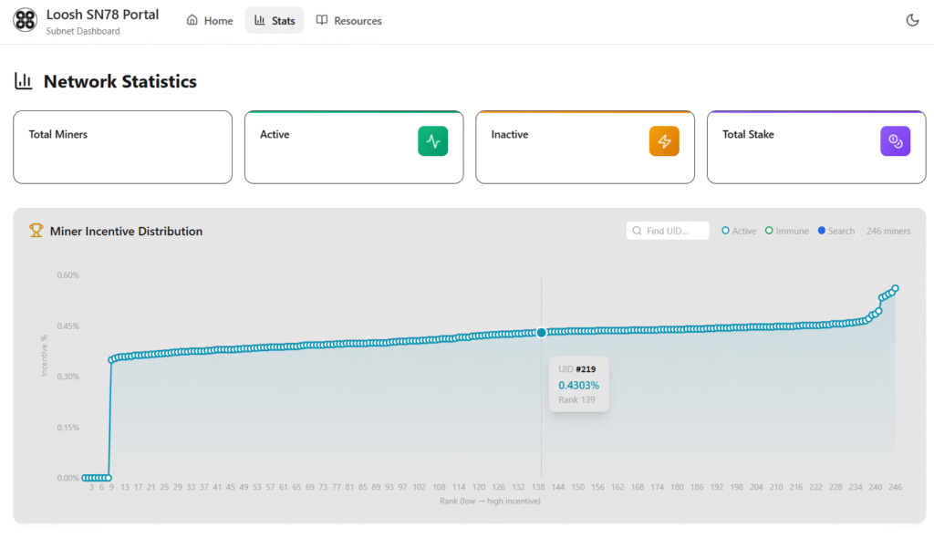 NETWORK VISIBILITY: Real-time subnet statistics, active miner distribution, stake allocation metrics, and transparent ‘miners’ leaderboard rankings.