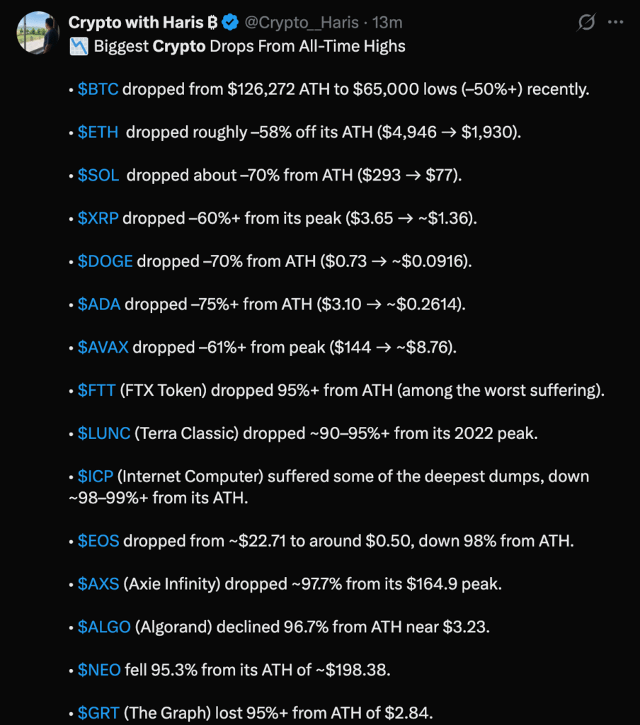 When Bitcoin falls this hard, altcoins rarely survive untouched. They become collateral damage.