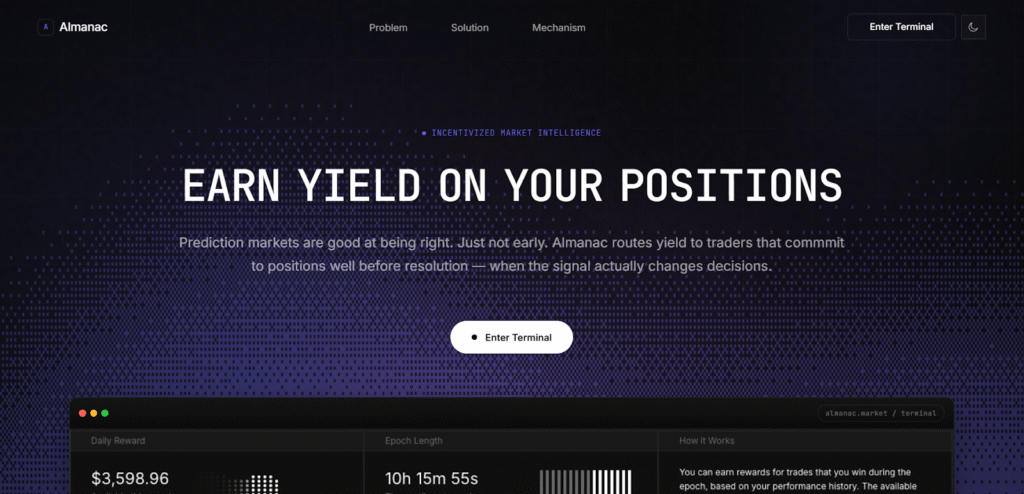 Where traditional prediction markets reward traders primarily for being correct at resolution, Almanac focuses on accuracy across time. The platform introduces mechanisms that incentivize participants to take and maintain positions earlier, when the information value of forecasts is highest.