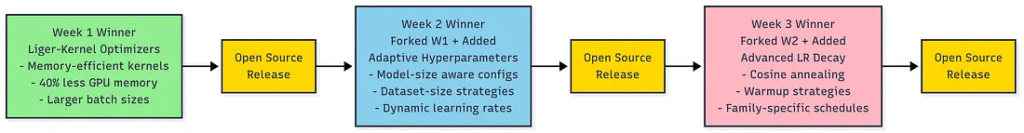 The real transformation came with the launch of Gradients’ open-source tournament system. Instead of hiding behind closed codebases, miners now compete publicly, registering their repositories and sharing their full training scripts when they win.