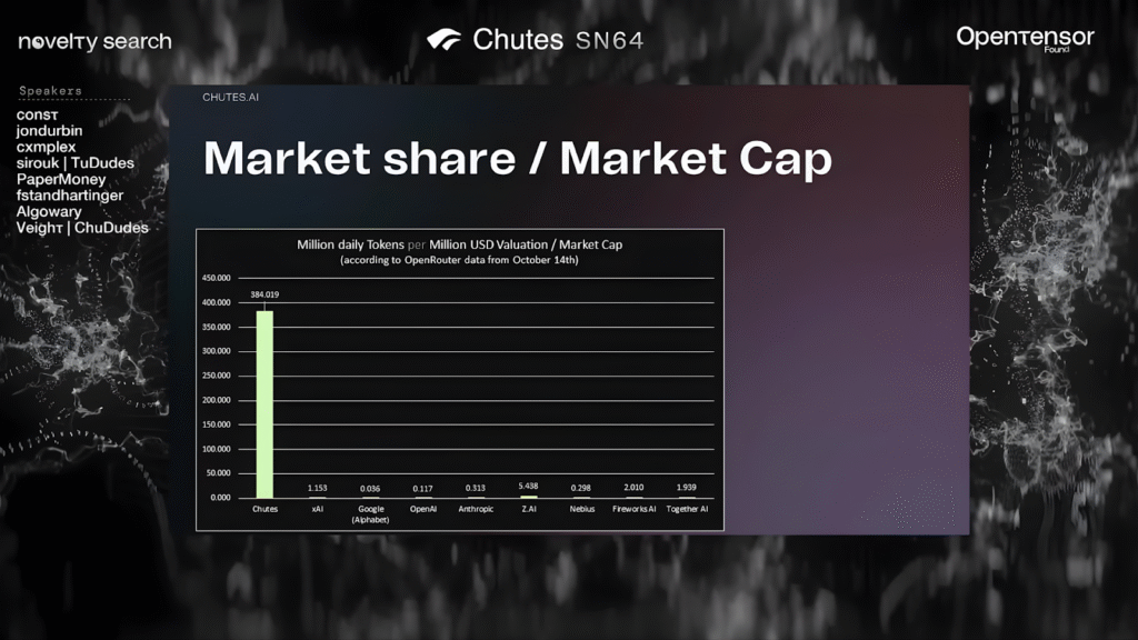 Chutes makes a bold claim about efficiency compared to big tech companies. They calculate something they call tokens per dollar of valuation, basically, how much actual AI output you generate relative to your company’s worth.