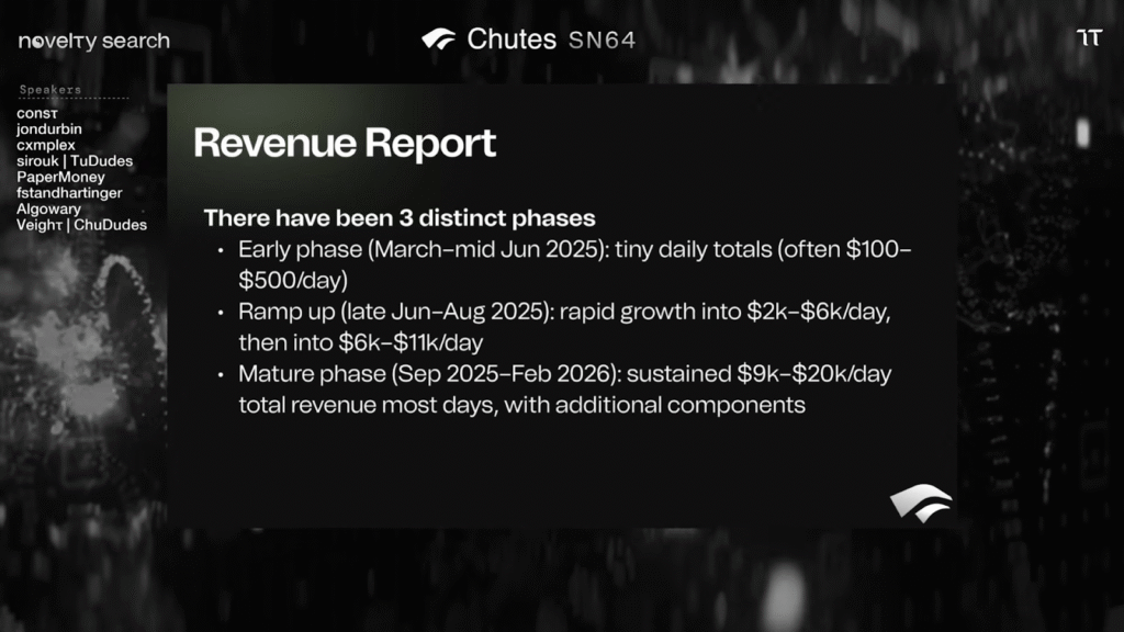 During the NS episode, Chutes shared financial records tracking their rise from a few hundred dollars a day in early 2025 to a consistent run rate of $9,000 to $20,000 daily. With a recent peak of $22,000 in a single day, the subnet has generated $1,355,176 in the last quarter alone.