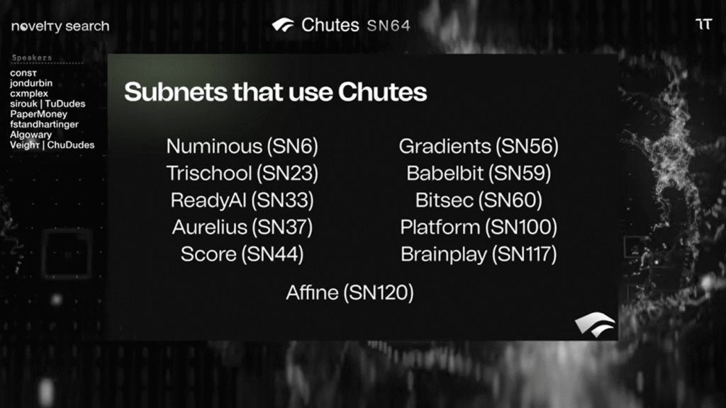 Affine is far from the only major player relying on this infrastructure. Chutes has effectively positioned itself as the cloud backbone for a significant portion of the Bittensor ecosystem, powering a diverse roster of top-tier subnets. The list of active users includes heavy hitters like Numinous (SN6) and Gradients (SN56), alongside specialized projects such as Trishool (SN23), ReadyAI (SN33), Aurelius (SN37), etc.