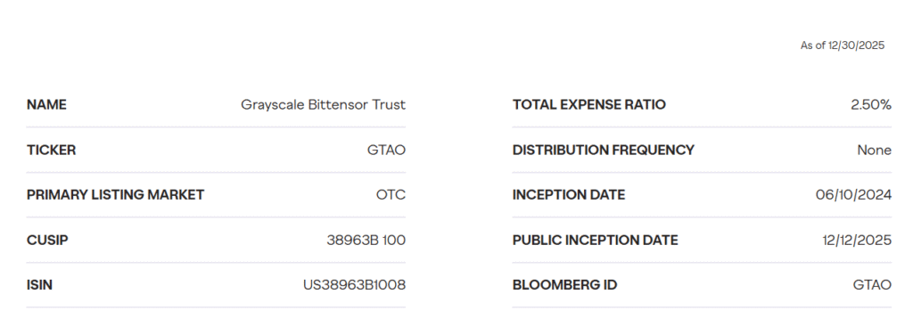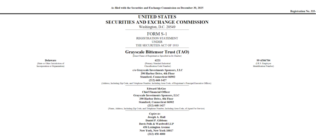 On December 30, 2025, Grayscale Investments submitted an initial Form S-1 registration statement to the U.S. SEC (Securities and Exchange Commission) for $GTAO (Grayscale Bittensor Trust).