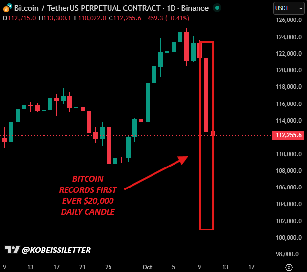Amid the liquidations, Bitcoin recorded a $20,000 daily candlestick, marking a $380 billion swing in its market cap within a single day.