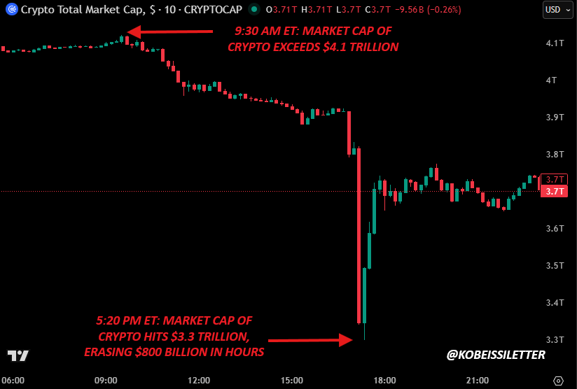 Between 9:30 AM ET and 5:20 PM ET, the crypto market erased $800 billion in total capitalization.