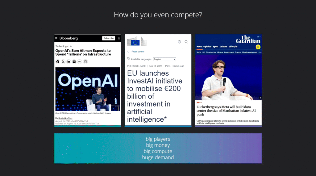 The biggest players in the space, OpenAI, Meta, and the European Union, are spending hundreds of billions of dollars building massive centralized data centers, some with dedicated power plants, to meet anticipated demand. AI-focused startups, flush with venture capital, are subsidizing inference at below-cost prices to capture market share, making it nearly impossible for smaller competitors to match their pricing on a level playing field.