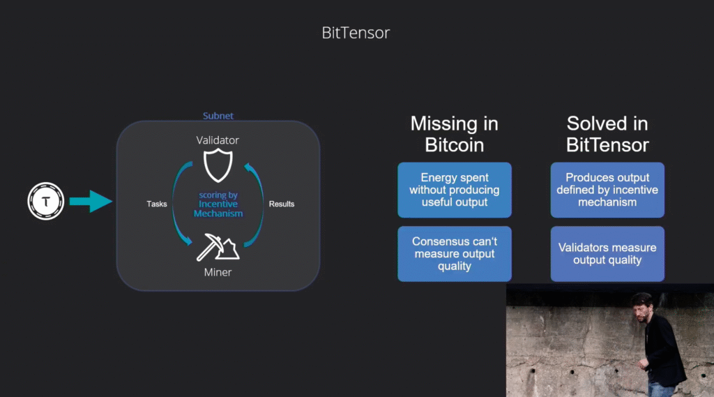 Bittensor was designed to address exactly those gaps. He cited co-founder Jacob Steves’s vision of a network where intelligence itself is the commodity, owned by no one and accessible to everyone. The key innovation is the addition of validators who score miners’ work through a hardcoded incentive mechanism, a system that can quantify not just whether work was done, but how well it was done.