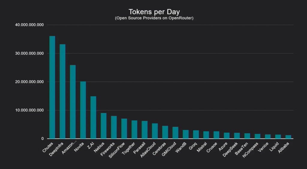 The most striking data point in Florian’s talk was Chutes’ current market position. On Open Router, the largest AI inference marketplace, Chutes is the number-one provider by daily token volume among open-source inference services, processing billions of tokens per day.