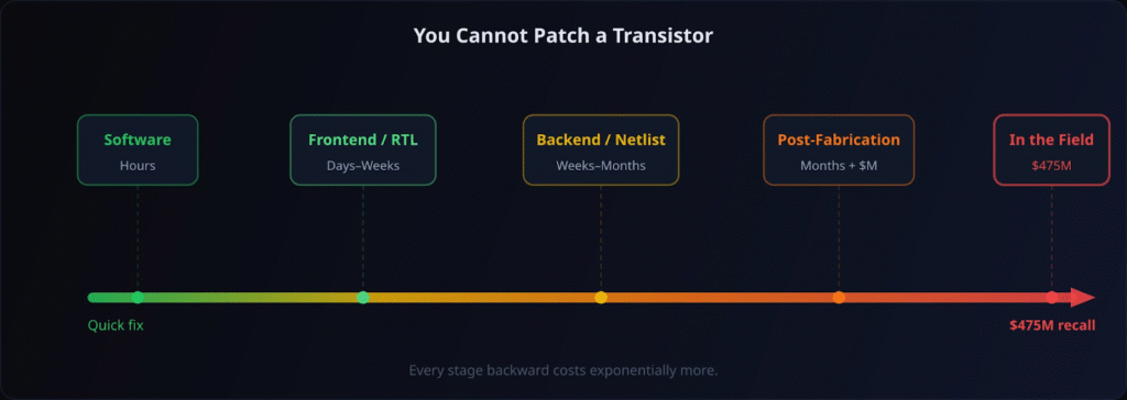 Unlike software systems, where testing can be iterative and patches can be deployed after release, hardware must be correct before fabrication. Once a chip is manufactured, errors cannot be patched, and the cost of mistakes increases dramatically depending on when they are discovered.