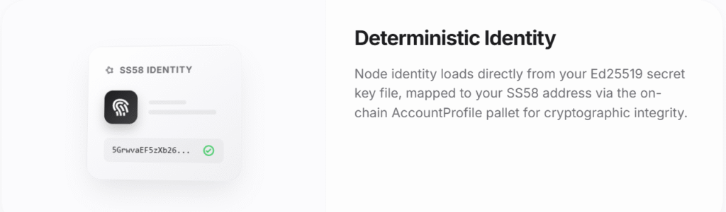 Users’ node identity is cryptographically linked to their respective wallets, ensuring that ownership is preserved and impersonation is prevented. This mode of operation alone is deterministic and verifiable.