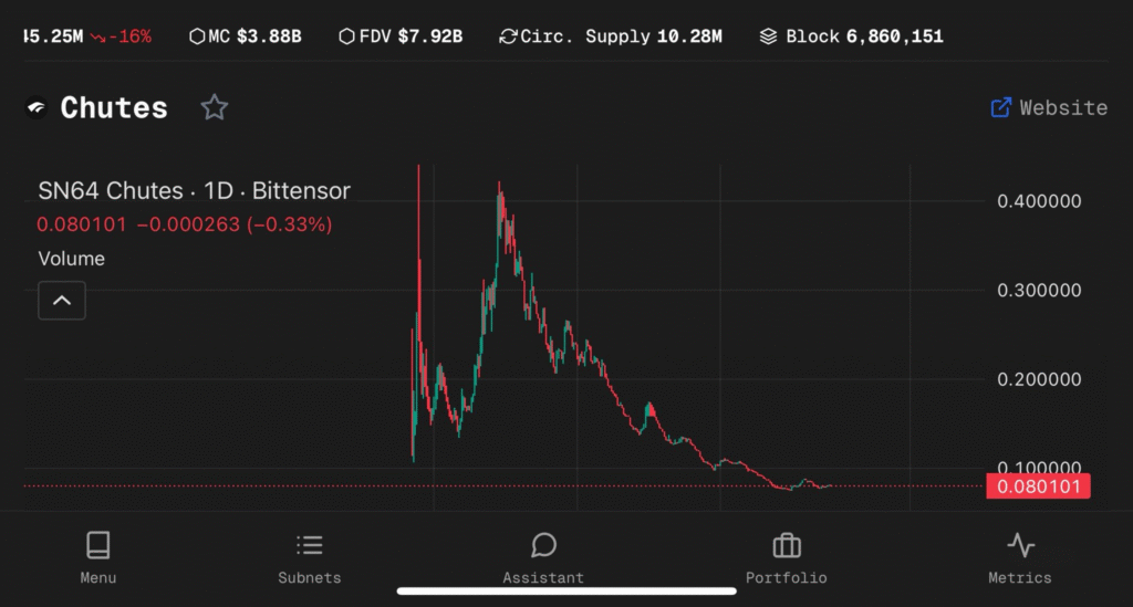 One of the biggest mistakes traders make is emotional attachment. Take Chutes for example; it’s an awesome subnet, but its chart has gone straight down for months.