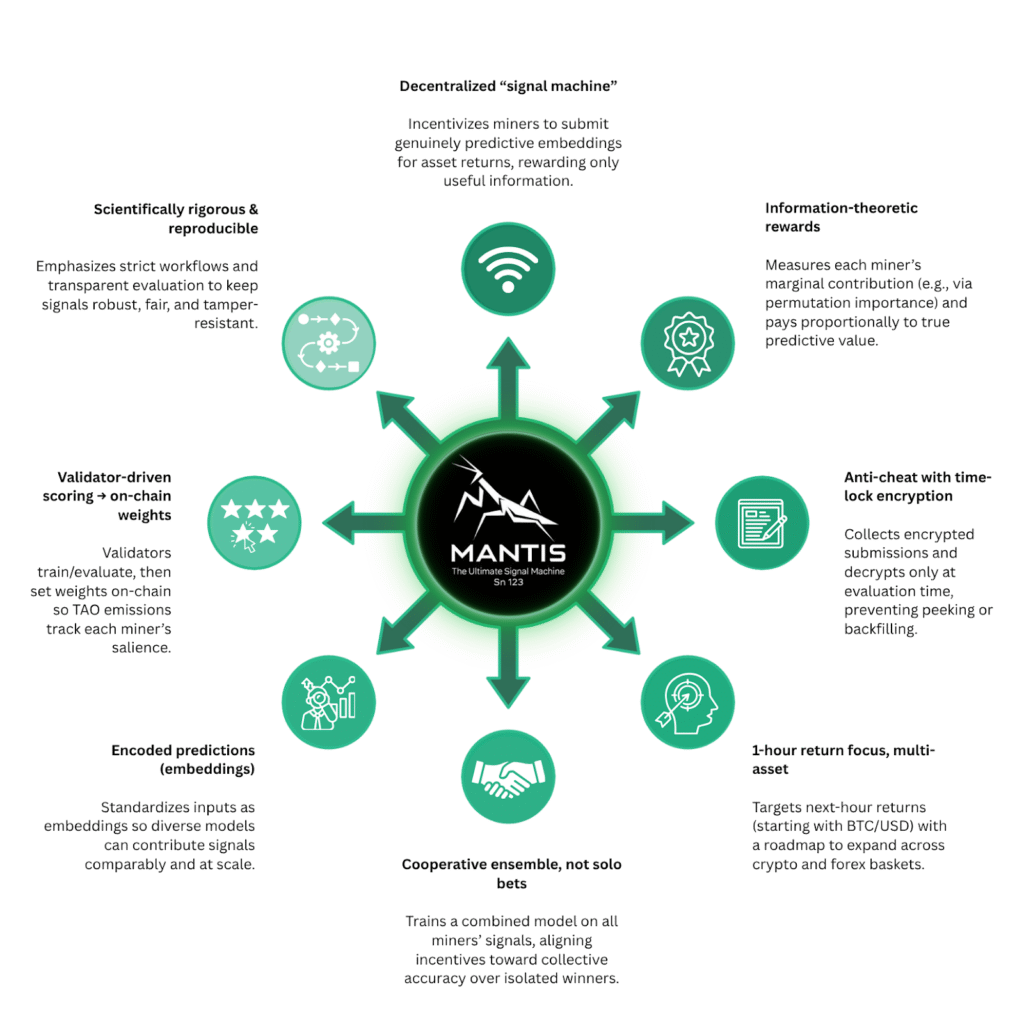 Rather than forecasting a single price in isolation, MANTIS measures how useful a signal is within the broader predictive ensemble. It is effectively a decentralized signal refinery.
