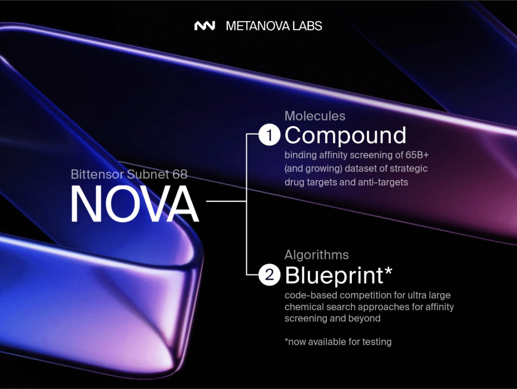 NOVA Blueprint shifts attention from individual molecules to the algorithms that search chemical space itself. Miners submit code designed to explore ultra-large chemical universes more effectively and generalize across changing targets.
