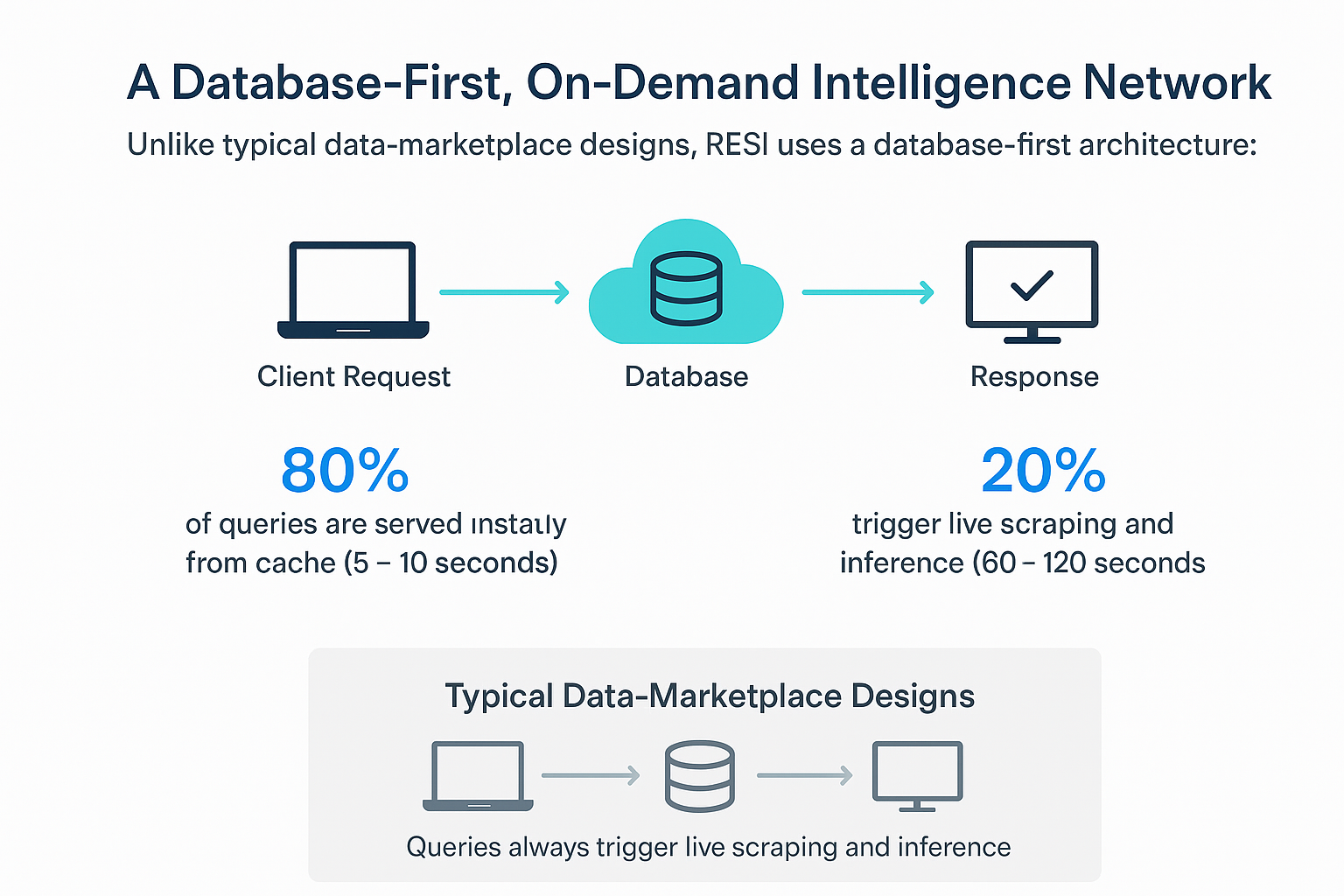 Unlike typical data-marketplace designs, RESI uses a database-first architecture that allows users to get near-instant answers for most requests: