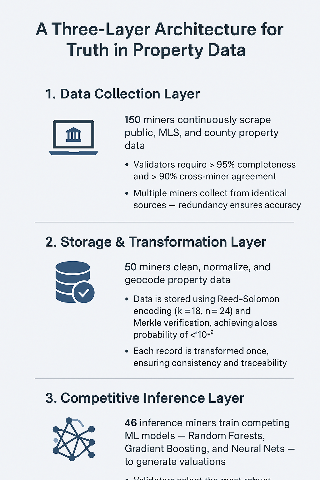 Together, these layers form an autonomous, self-verifying pipeline: from raw property data → normalized intelligence → real-time valuations, all coordinated through validator consensus.