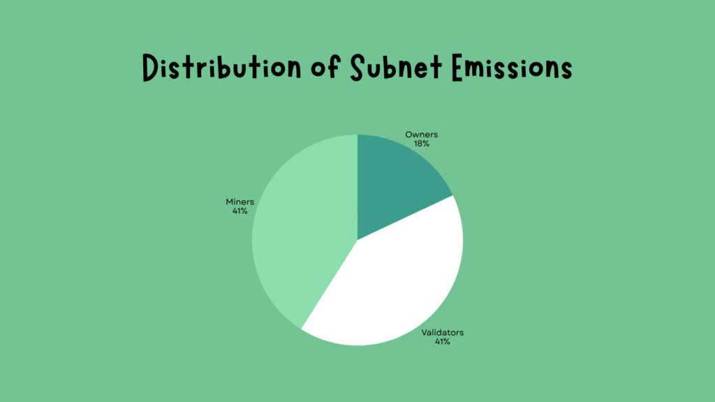 a. Direct emissions make up the first and most immediate income stream. After the subnet owner’s 18% cut is deducted from total subnet emissions, approximately 41% flows to validators and 41% to miners.
