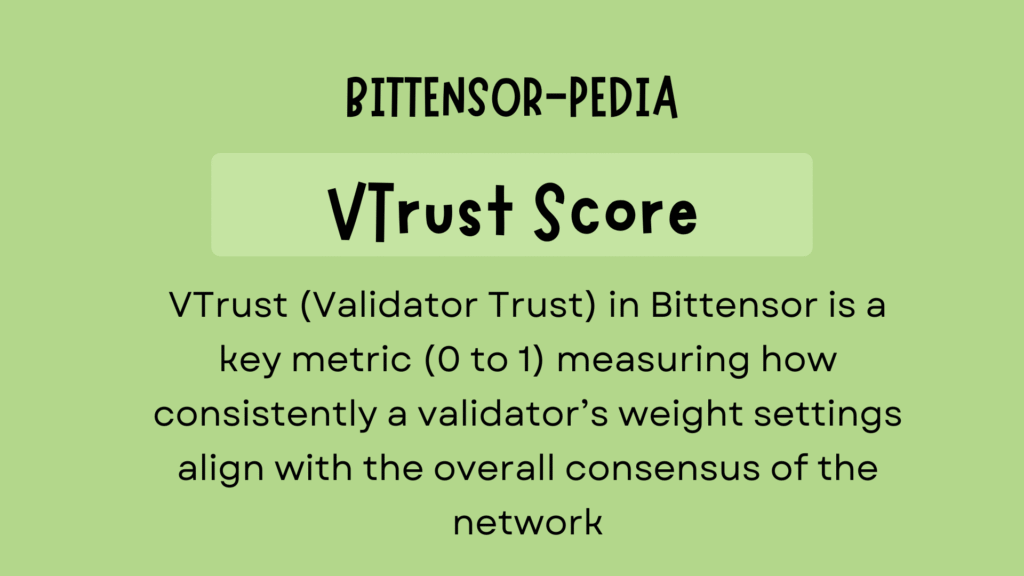 A validator’s individual share of that 41% is determined by two factors working together: the relative stake they hold on the subnet, and their VTrust score, which measures how consistently their submitted weights align with the consensus of other validators.