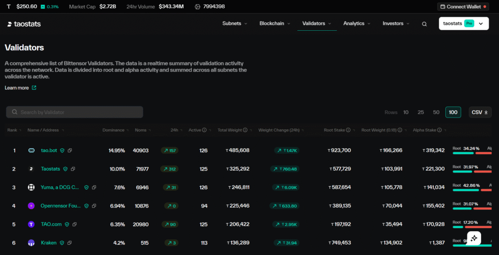 d. Subnet β$ALPHAβ Token Visibility: Dynamic TAO gives validators early and detailed visibility into which subnets are gaining momentum before the broader market catches on. That information edge creates meaningful opportunities to accumulate undervalued alpha tokens at the early stages of a subnet’s growth cycle.